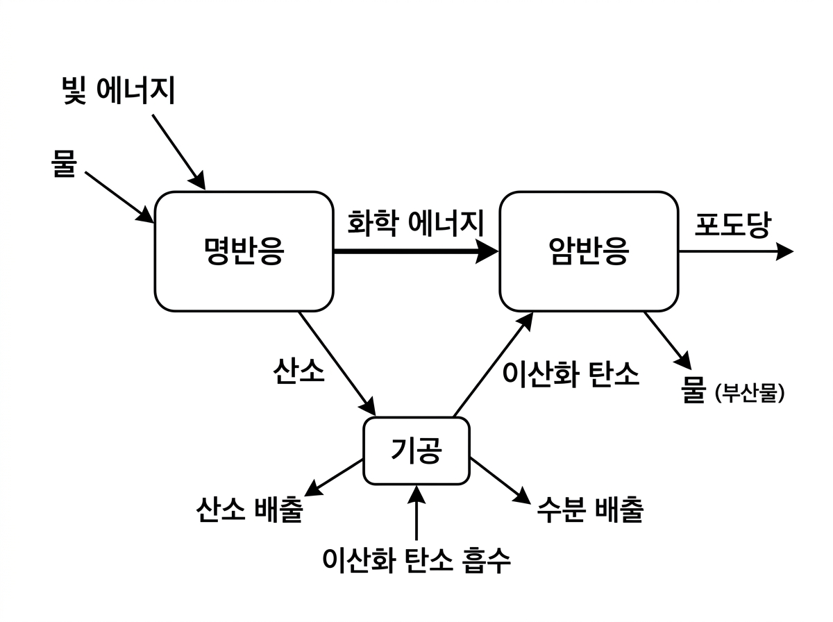 암반응의 부산물은 '산소'가 아니라 '물'이다. 지문에서 "포도당을 생성하고, 부산물로 물이 생기는 단계"라고 명시하고 있다.