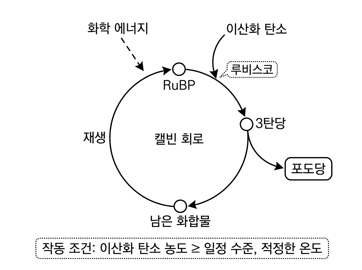 이러한 순환 과정을 캘빈 회로라고 하는데, 캘빈 회로로 포도당이 생성되려면 일정 수준 이상의 이산화 탄소 농도, 적정한 온도 등의 환경이 갖추어져야 한다.