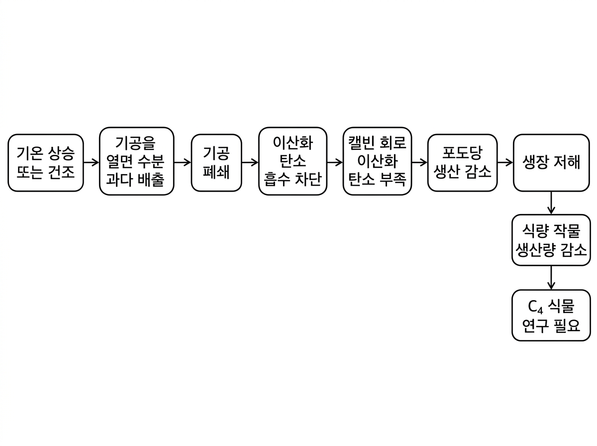 그런데 C3 식물은 기온이 높거나 건조할 때 광합성의 효율이 저하되는 한계가 있다. 기온이 높거나 날씨가 건조할 때 기공을 열면 체내의 수분이 지나치게 배출되므로 식물은 기공을 열지 않는다. 이로 인해 포도당의 생산이 어려워지면 식물은 잘 생장하지 못한다. 가령 이상 기후 현상으로 인하여 고온의 기후가 지속되는 상황이 발생하면 위와 같은 문제가 심화될 수 있으며, C3 식물이자 대표적인 식량 작물인 쌀과 밀 등의 생산량이 감소하는 문제로 이어질 수 있다. 이에 따라 C3 식물과 다른 방식으로 광합성을 하여 고온에서도 잘 자랄 수 있는 ㉡C4 식물에 대한 연구가 활발히 진행되고 있다.