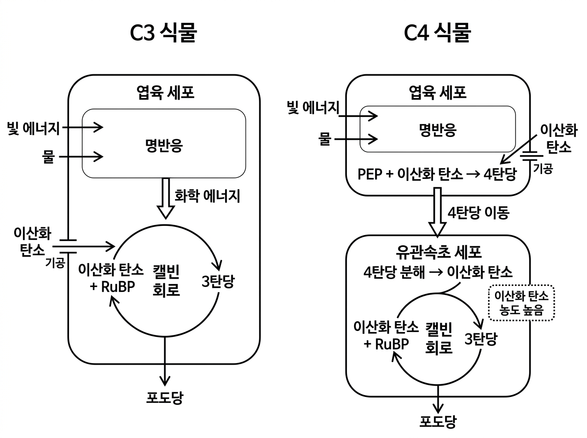 옥수수, 조, 수수 등 고온의 열대 지방에서도 잘 자라도록 진화한 C4 식물은 두 개의 공간에서 광합성이 진행된다는 특징이 있다. 첫 번째 공간인 엽육 세포는 C3 식물과 같은 방식으로 명반응이 일어나는 곳이자, 암반응의 첫 번째 단계로 탄소를 저장하는 역할을 하는 곳이다. 이 식물의 엽육 세포에는 이산화 탄소와 결합하는 역할을 하는 PEP가 존재한다. PEP와 이산화 탄소가 결합되면 4개의 탄소가 포함된 화합물인 4탄당이 형성되는데, C4 식물은 이를 고려하여 붙여진 이름이다. 4탄당은 엽육 세포에 저장되어 있다가 ㉡유관속초 세포라는 두 번째 공간으로 이동한 후 분해되어 포도당 생성에 필요한 이산화 탄소를 배출한다. 그리고 배출된 이산화 탄소는 유관속초 세포 속에 농축되었다가 캘빈 회로를 통하여 포도당을 형성하는 데 쓰이는데, C3 식물과 C4 식물의 캘빈 회로의 작동 방식은 동일하다. 이러한 방식으로 C4 식물은 유관속초 세포 속의 이산화 탄소 농도를 높게 유지함으로써 C3 식물에 비해 높은 광합성 효율을 보인다.