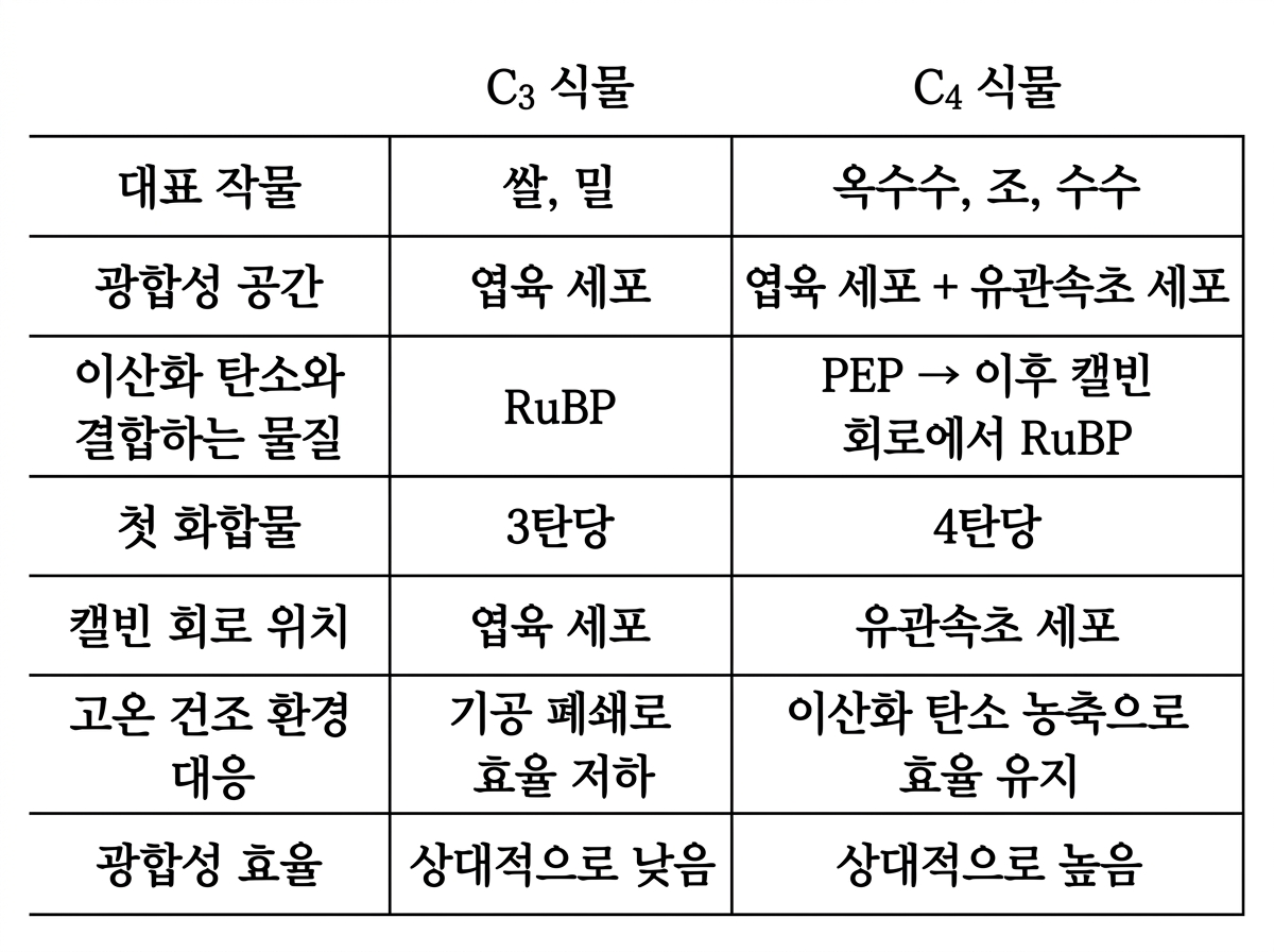옥수수, 조, 수수 등 고온의 열대 지방에서도 잘 자라도록 진화한 C4 식물은 두 개의 공간에서 광합성이 진행된다는 특징이 있다. 첫 번째 공간인 엽육 세포는 C3 식물과 같은 방식으로 명반응이 일어나는 곳이자, 암반응의 첫 번째 단계로 탄소를 저장하는 역할을 하는 곳이다. 이 식물의 엽육 세포에는 이산화 탄소와 결합하는 역할을 하는 PEP가 존재한다. PEP와 이산화 탄소가 결합되면 4개의 탄소가 포함된 화합물인 ㉠4탄당이 형성되는데, C4 식물은 이를 고려하여 붙여진 이름이다. 4탄당은 엽육 세포에 저장되어 있다가 유관속초 세포라는 두 번째 공간으로 이동한 후 분해되어 포도당 생성에 필요한 이산화 탄소를 배출한다. 그리고 배출된 이산화 탄소는 유관속초 세포 속에 농축되었다가 캘빈 회로를 통하여 포도당을 형성하는 데 쓰이는데, C3 식물과 C4 식물의 캘빈 회로의 작동 방식은 동일하다. 이러한 방식으로 C4 식물은 유관속초 세포 속의 이산화 탄소 농도를 높게 유지함으로써 C3 식물에 비해 높은 광합성 효율을 보인다.