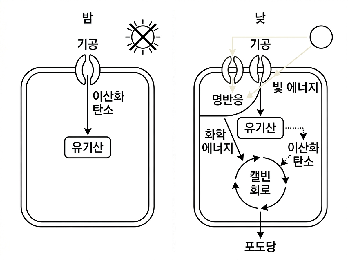 사막의 선인장과 같은 식물인 A는 고온 건조한 환경에 서식하며, 낮과 밤에 서로 다른 방식으로 광합성에 필요한 과정을 수행한다. A는 밤에 기공을 열어 대기 중의 이산화 탄소를 흡수하고, 흡수된 이산화 탄소를 특정 유기산의 형태로 세포 내에 저장한다. 낮이 되면 A는 기공을 닫아 수분 손실을 막은 채, 저장해 두었던 유기산을 분해하여 이산화 탄소를 방출한다. 방출된 이산화 탄소는 세포 내에 농축되었다가 캘빈 회로에 사용되어 포도당이 생성된다. 이러한 A의 과정은 C4 식물과 달리 하나의 세포 안에서 시간 차를 두고 진행된다.